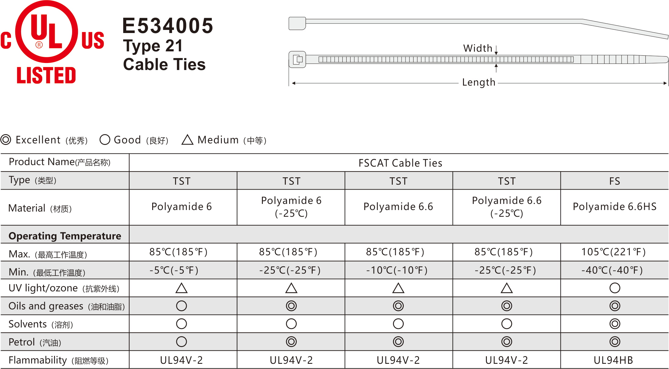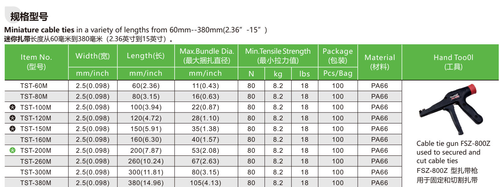 标准自锁式扎带提供多种规格,包括 2.5mm 迷你型、3.6mm 中型、4.8mm 标准型、7.6mm 重型、9mm 超重型,以及 12.4mm 超超重型扎带。它们采用高强度尼龙66材料制成,具有出色的耐用性和抗拉性能,适用于各种工业和日常应用。